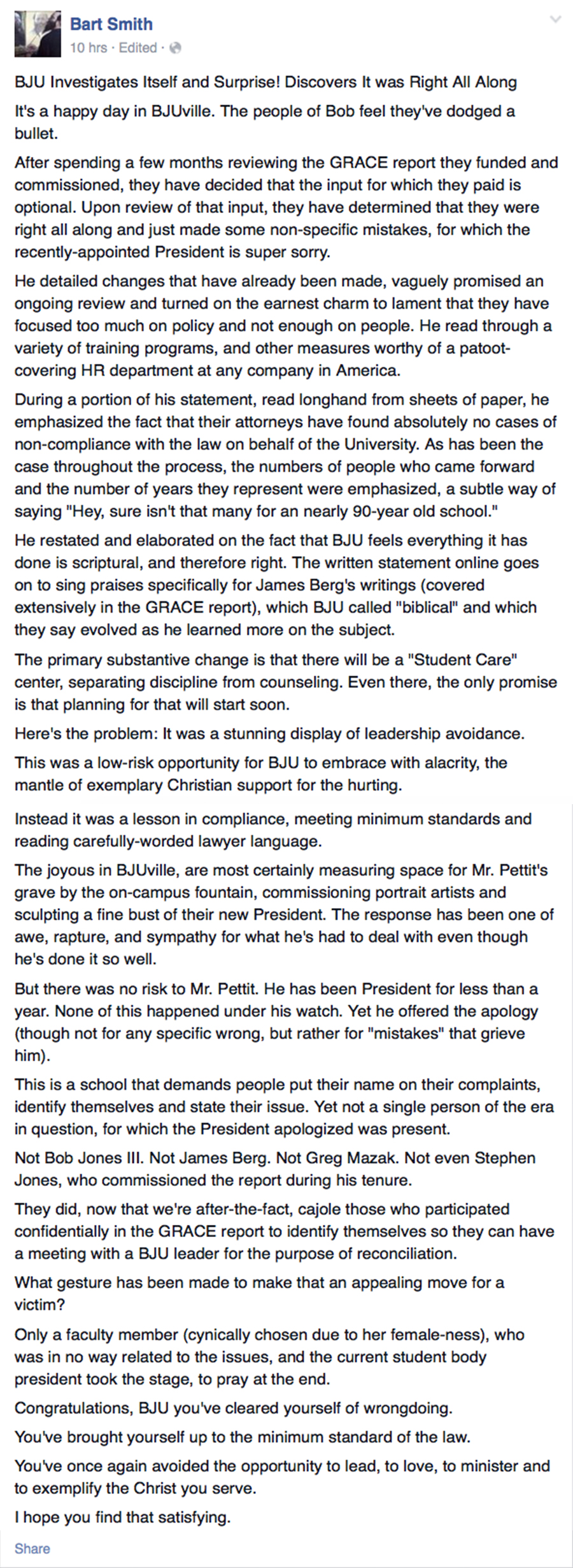 3. A BJU alum wrote a better response on FB than I ever could to express how I feel about the University’s response. So here you go: