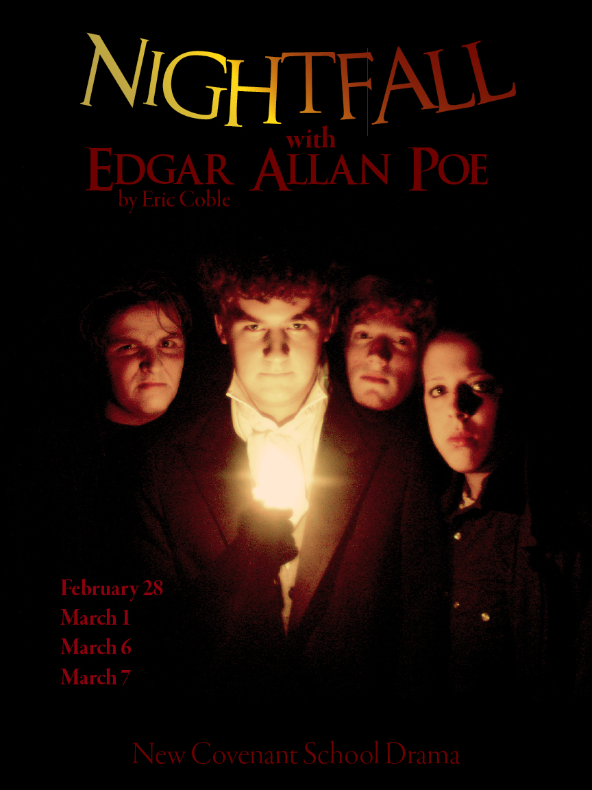 The featured image for this post is a promotional still shot from the 2008 NCS performance of the play Nightfall with Edgar Allan Poe by Eric Coble. We shot this image inside the pitch-black gym/auditorium. I think it turned out rather well, and it made for a cool poster too after it was edited, one of a series of four. Hey, we might have been a tiny school with zero budget, but we could rock the PR machine.